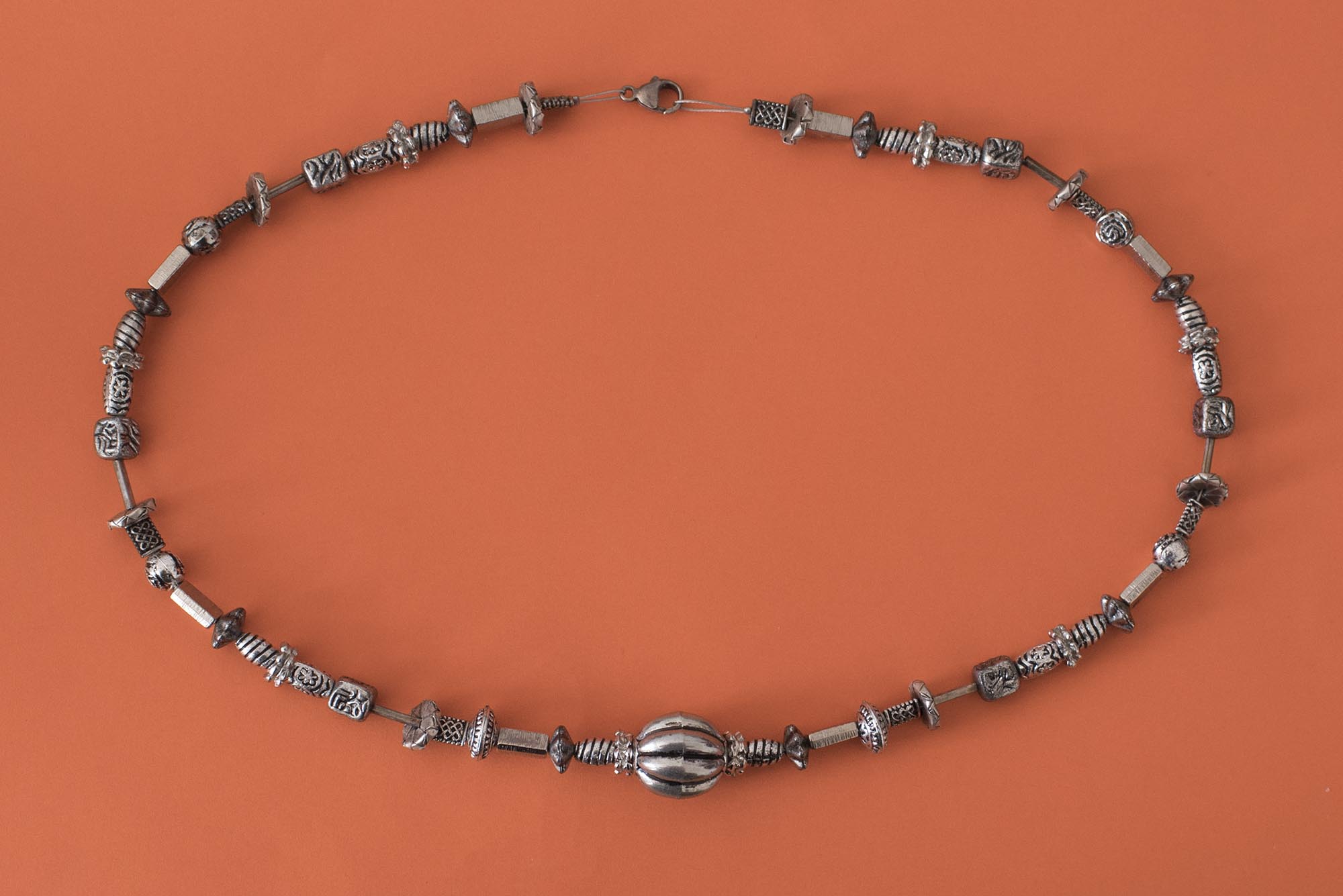 Das Foto zeigt die Kette auf einen knallorangenen Hintergrund. Die Kette besteht aus silbernen Perlen. Es gibt immer abwechselnd eine längliche Perle und eine runde Perle. In der Mitte der Kette gibt es eine große Perle mit Rillen.