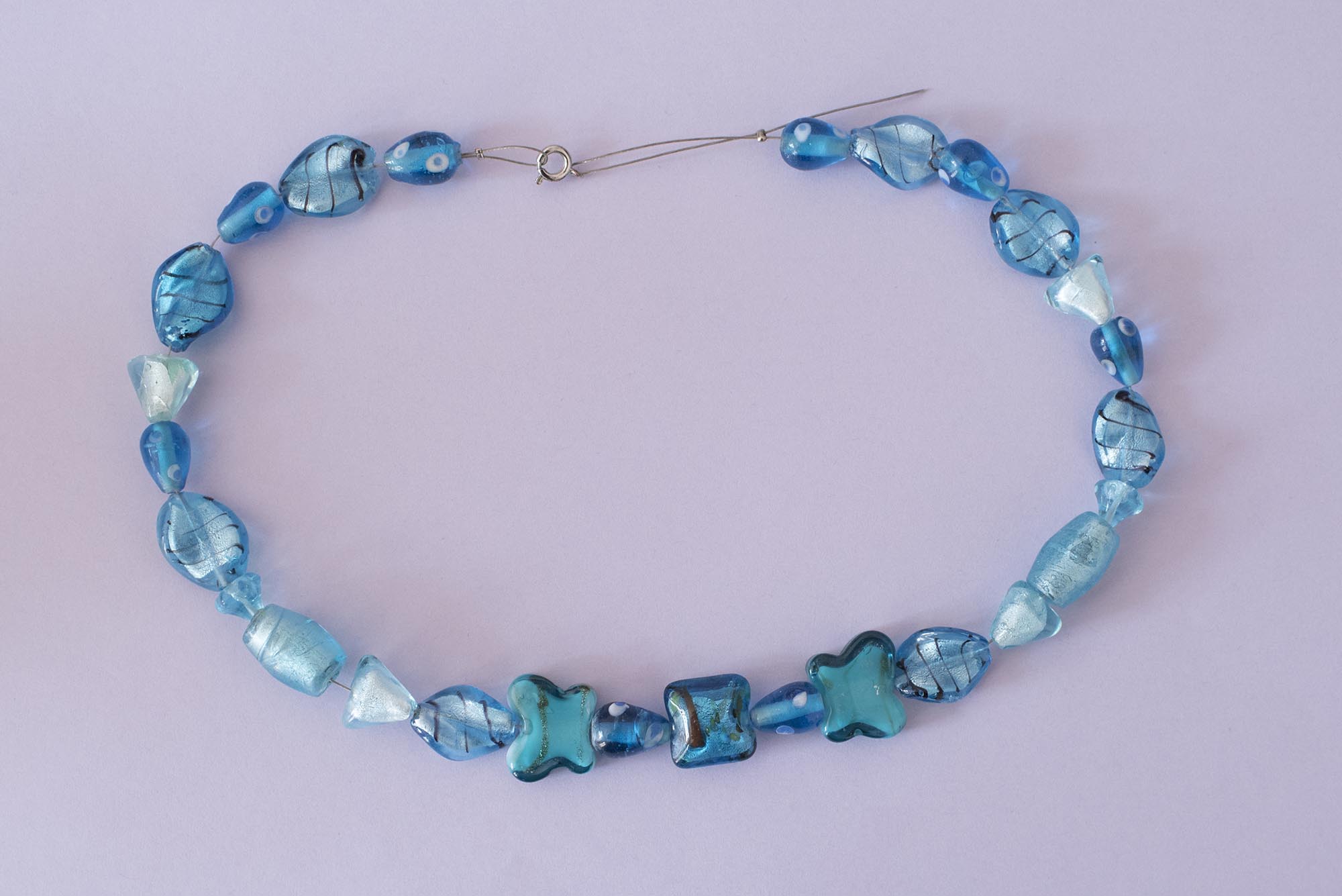 Das Foto zeigt die Kette auf einem fliederfarbenen Untergrund. Sie besteht aus unterschiedlich geformten Glasperlen aus transparentem hellblauen und türkisfarbenen Glas. Einige Perlen sind oval, andere länglich in sich gedreht (wie ein Windhauch, der gerade weht). In der Mitte gibt es zwei Glasperlen in der Form von Schmetterlingen.