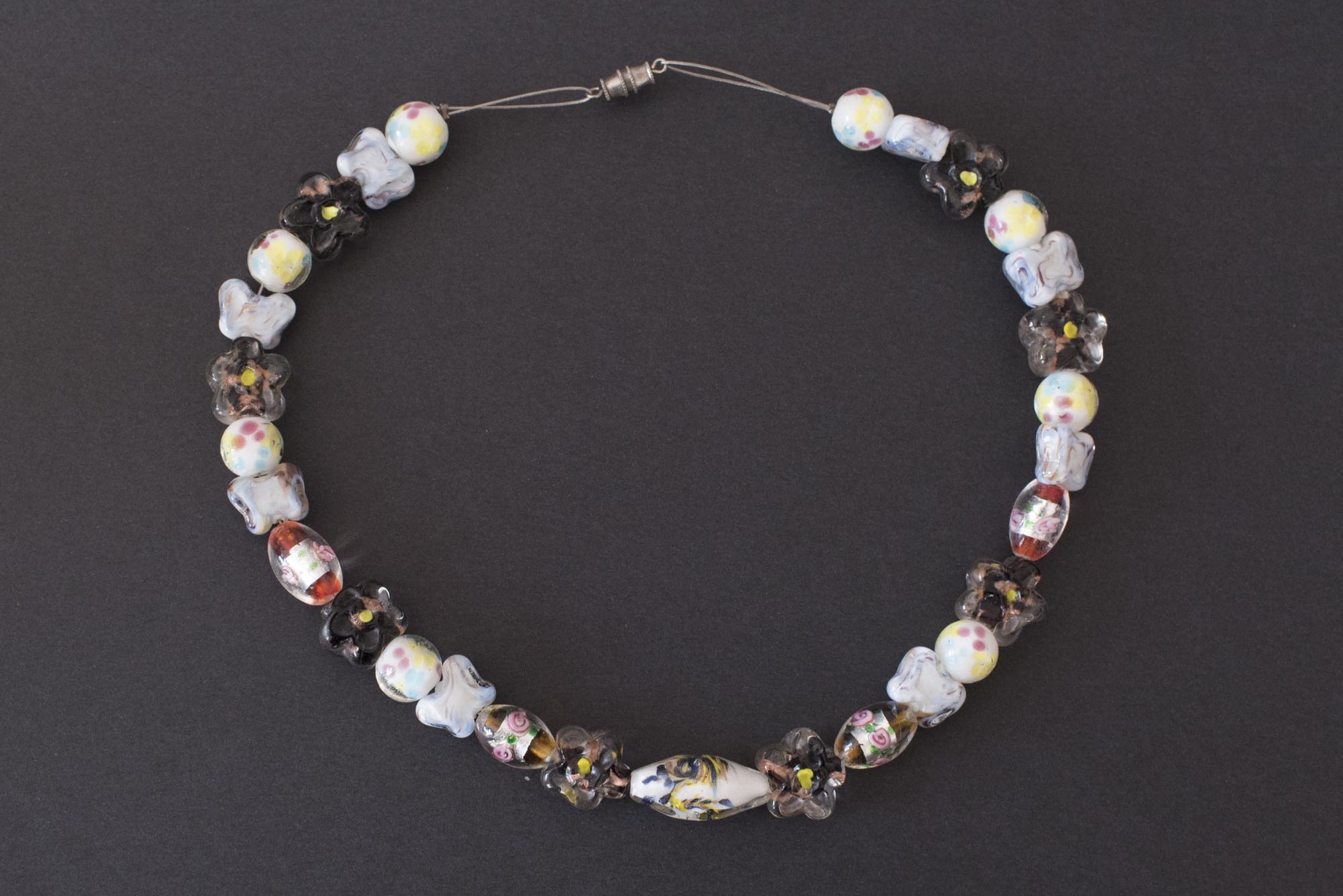 Das Foto zeigt die Kette Sommergruß auf schwazem Grund. Sommergruß ist eine kurze Kette aus großen und vielfarbigen Glasperlen. Die Farben der bunten Perlen reichen von weiß, über hellgelb, hellblau und violett bis zu bronzefarbenen und schwarzen "Highlights." Die Perlen der Kette sind immer abwechselnd rund oder in der Form von Schmetterlingen und Blüten.