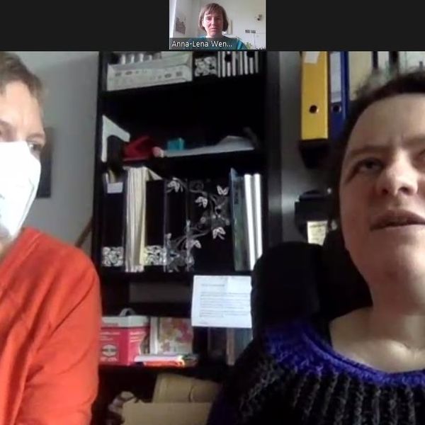 Bildbeschreibung: Das Bild zeigt einen Screenshot vom Zoom-meeting, das wir für die Aufnahme des Radiosalons im Mai 2021 gemacht haben. Rechts im Bild sieht man Katrin Dinges, links im Bild ist Julia Bonn zu sehen. Julia trägt eine FFP2 Maske und schaut zu Katrin. Katrin und Julia sindim gleichen Zimmer, im Hintergrund sind einige Ordner zu sehen. Ein kleines Rechteck in dem Anna-Lena Wenzel zu sehen ist, ist oben in der Mitte. Links oben in der Ecke steht ganz klein neben einem roten Punkt: Aufzeichnung läuft… Einführungstext der Radiosendung Wie können Menschen mit Behinderungen die eigene Einzigartigkeit stark machen und Vorurteilen und defizitären Zuschreibungen entkommen? Welche Vorbilder und Rollenmodelle gibt es — in Märchen, in Geschichten und im Leben? Und welche braucht es noch? Wir sprechen mit Katrin Dinges über das Anders-sein, über Ausschlüsse im (Berufs-)leben, Resilienz und ein positives Selbstbild. Ein Gespräch per Zoom mit Hilfe von drei Laptops und einer Braillezeile. Wir sprechen mit Katrin Dinges über das Anders-sein, über Ausschlüsse im (Berufs-)leben und ihren beeindruckenden Kampf für ein selbstbestimmtes Leben und ein positives Selbstbild. Ein Gespräch per Zoom mit Hilfe von drei Laptops und einer Braillezeile.