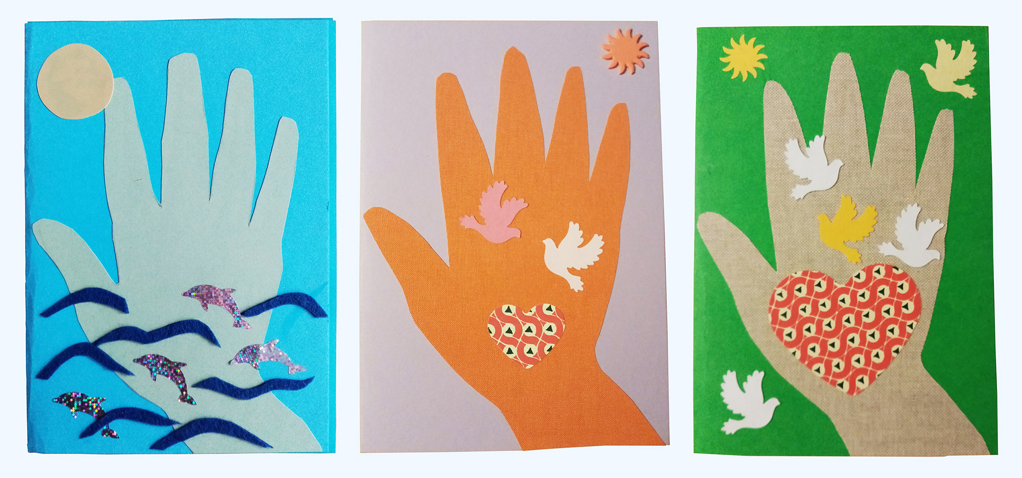 Auf diesem Foto sind drei Karten zu sehen. Die ganz linke Karte hat einen türkisen Hintergrund. Auf ihm klebt ein Umriss von Katrin Hand in hellblau. Auf dem unteren Drittel der Karte sind dunkelblaue Wellen aus Filz aufgeklebt. Zwischen und über den Wellen springen vier silberne Delfine. Oben über dem Zeigefinger an der linken Bildecke leuchtet eine warme hellgelbe Sonne.