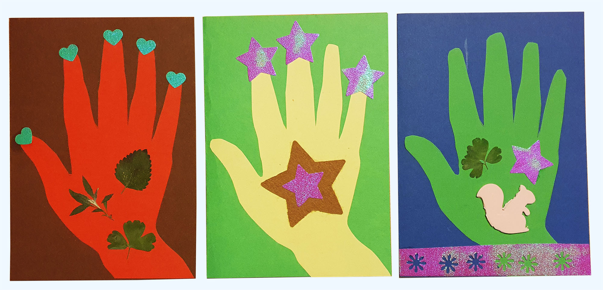 Die rechte Karte hat einen dunkelblauen Hintergrund. Auf dem Hintergrund klebt eine knallgrüne Hand. Auf dem Handrücken sieht man ein hellrosa Eichhörnchen. Es besteht aus Moosgummi und kann so gut ertastet werden. Über dem Eichhörnchen klebt ein grünes, getrocknetes Blatt. Neben dem Blatt sieht man einen rosa Stern mit fünf Zacken. Unten auf der Karte, am Handgelenk, zieht sich eine rosa Bordüre von links nach rechts. In der Bordüre sind fünf Blüten ausgestanzt.