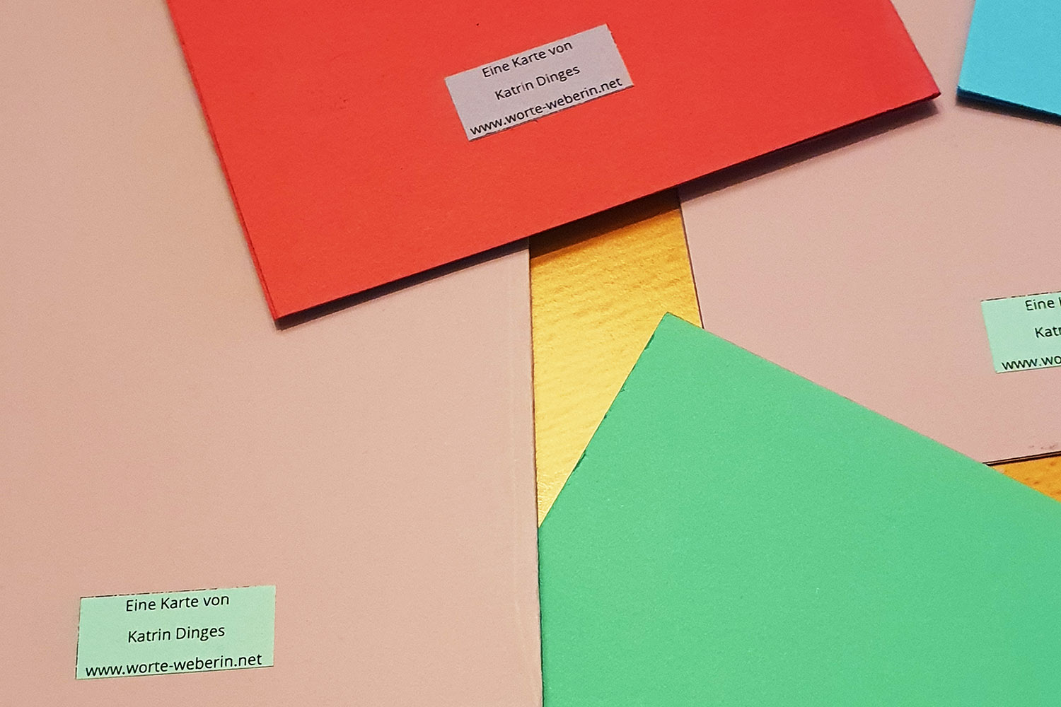 Dieses Foto zeigt die Rückseite der Karten. Auf einer Holzplatte liegen lose übereinander fünf von Katrins Karten. Es gibt eine rote Karte, eine türkise Karte, eine knallgrüne Karte und zwei Karten in flieder. Auf der Rückseite der Karten klebt mittig ein kleiner Sticker mit der Aufschrift: