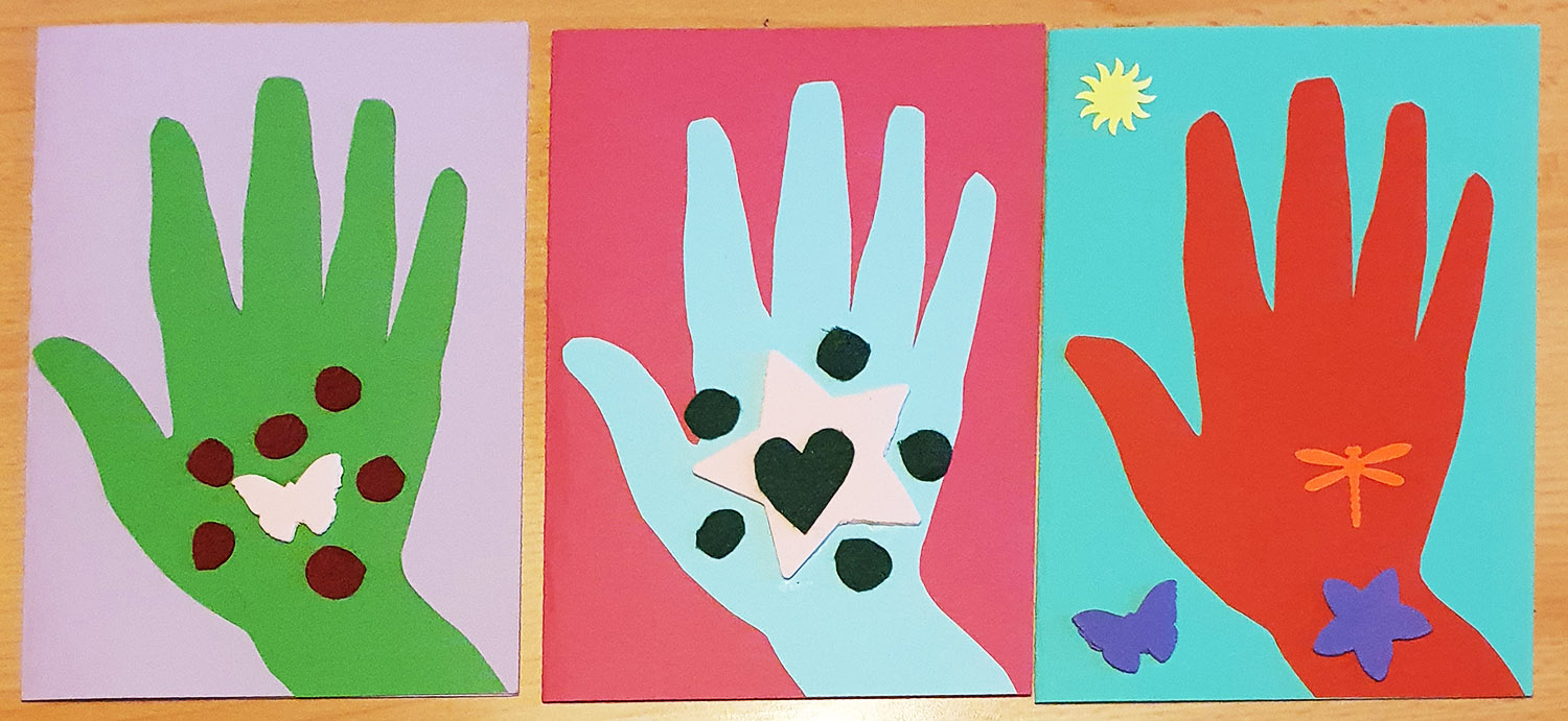 Die Karte ganz links ist fliederfarben. Auf ihr klebt der Umriss von Katrins rechter Hand in knallgrüner Pappe. Auf der Mitte des Handrückens ist ein hellrosa Schmetterling aufgeklebt. Der Schmetterling ist von sechs runden Punkten aus dunkelrotem Filz umgeben.