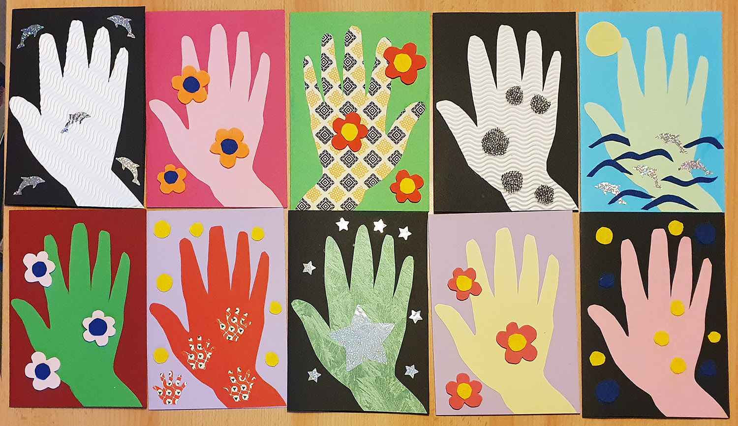 Auf diesem Foto sind 10 Karten zu sehen. Sie bestehen aus bunter Pappe und anderen Materialien. Es gibt zwei Reihen à 5 Karten.