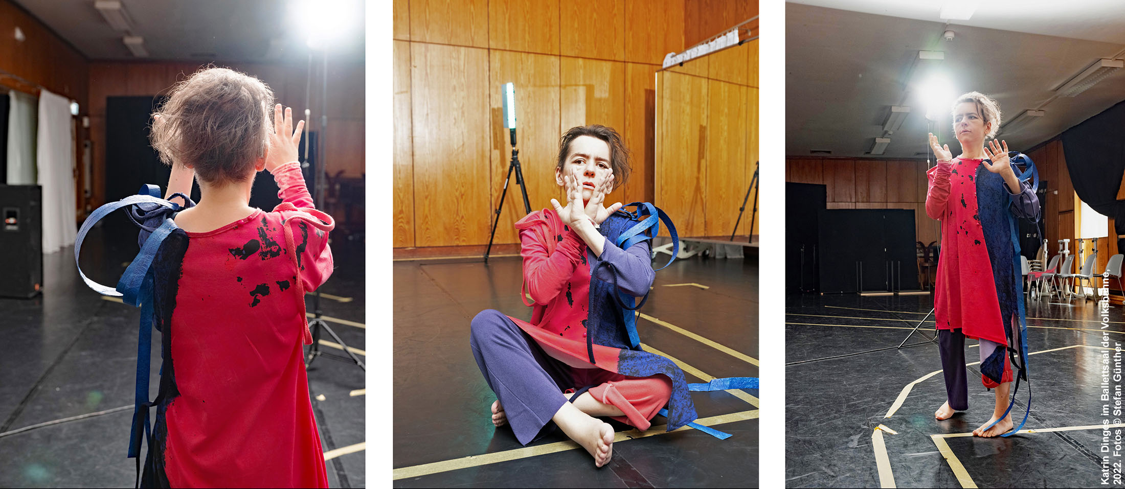 Zu sehen sind drei Fotos, die Katrin beim Tanz im Ballettsaal de Volksbühne in Berlin zeigen. Die Fotos wurden alle am gleichen Tag augenommen. Katrin trägt ein Kostüm in Magenta und einem tiefen Blau. Das Kostüm besteht aus einem knielangen Oberteil, das auf der linken Seite magenta und auf der rechten Seite blau ist. Am Schulterbereich der blauen Seite sind lange blaue Bänder angebracht, die die Schulter umschmeicheln. Die Bänder sind verschieden lang und einige gehen bis zum Boden. Das Kostüm wird von einer Hose ergänzt. Das eine Bein ist magenta, das andere blau. Das magentafarbene Hosenbein ist bis zum Knie aufgekrempelt.