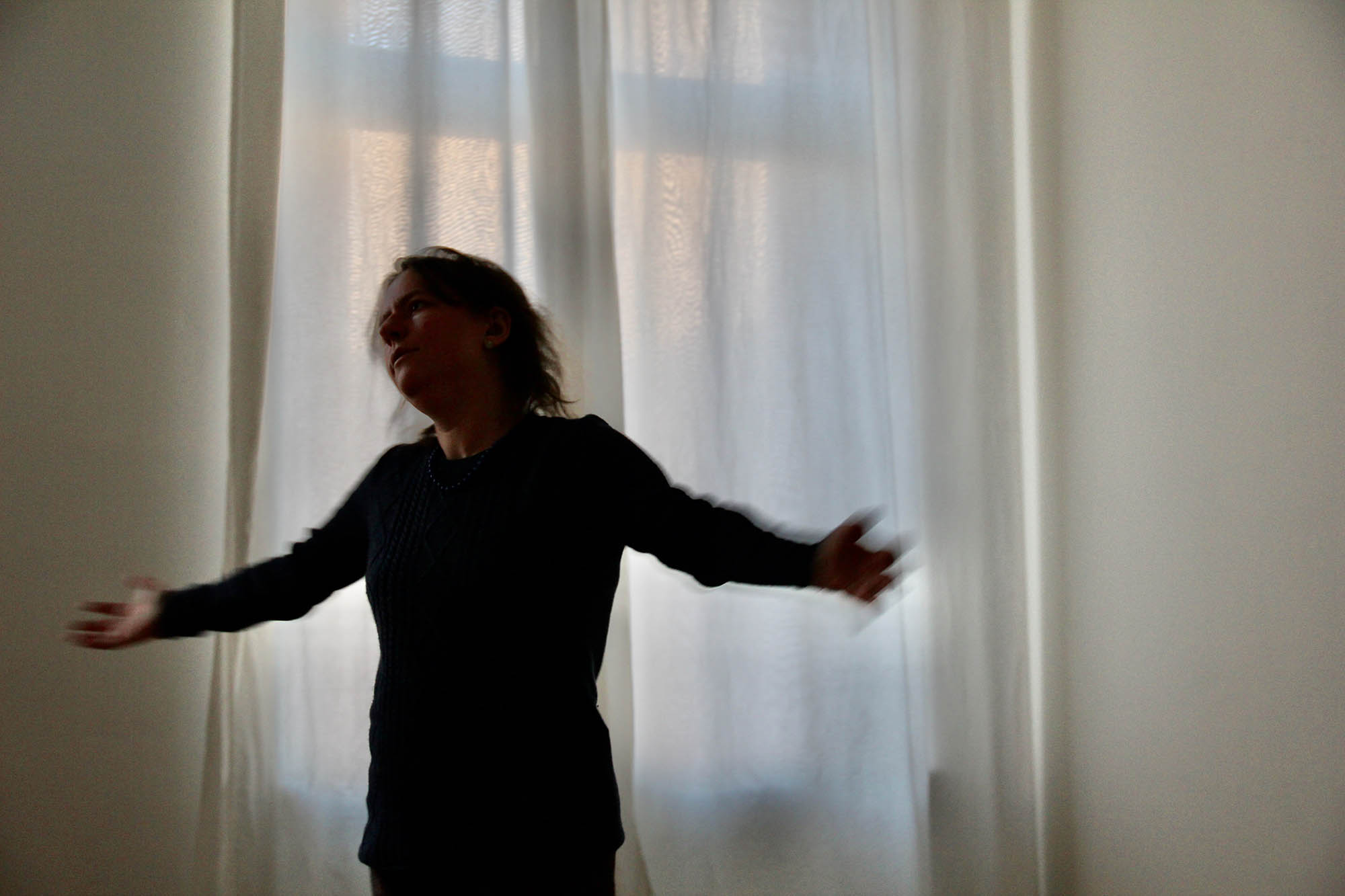 Dieses Foto zeigt Katrin Dinges beim Tanzen im Körperraum. Auf dem Foto zentral zu sehen ist Katrin Dinges. Katrin trägt ihre Haare offen. Ihr Kopf ist zur Seite gelehnt, Augen und Mund geschlossen. Sie öffnet ihre beiden Arme und auch die Hände als würde sie die Welt umarmen wollen. Katrin trägt ein dunkles langärmeliges Oberteil. Im Hintergrund sind Teile des Körperraums zu sehen: Weiße helle Wände und ein weißer lichtdurchlässiger Vorhang vor dem Fenster.